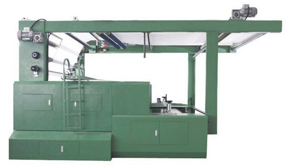 機(jī)頭進(jìn)布部分含有主機(jī)機(jī)頭、大輥簡(jiǎn)以及無(wú)張力進(jìn)布系統(tǒng)。進(jìn)布系統(tǒng)通過(guò)數(shù)個(gè)導(dǎo)輥,張力調(diào)節(jié)輥,對(duì)中輥的綜合調(diào)節(jié),使面料能夠以良好的張力狀態(tài)附著于規(guī)定尺度的導(dǎo)帶上面,對(duì)于針織面料等高、高彈性的面料。可選擇專業(yè)面料儲(chǔ)存器等輔助裝置,以期達(dá)到面料的經(jīng)緯方向保持在同一個(gè)伸縮率上。